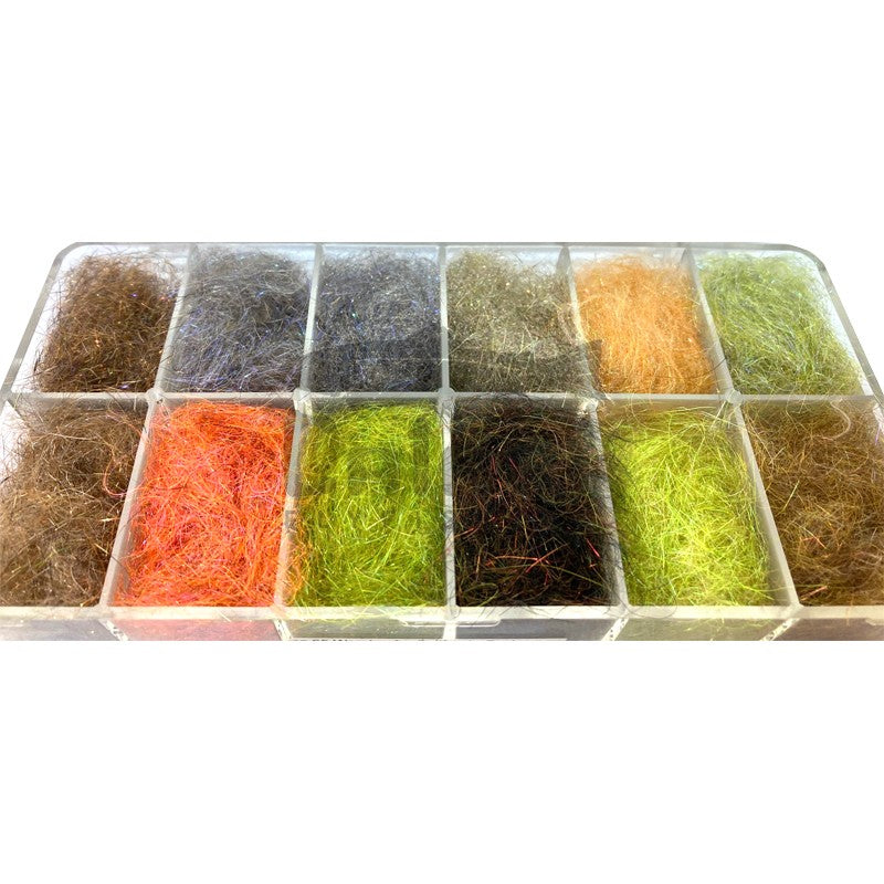 Whitlock's Dubbing Blends #1 - Couleurs : Red Fox Squirrel Thorax, Scud & Shrimp Gray, Sowbug Tan, Red Fox Squirrel Abdomen, Scud & Shrimp Olive, Scud and Shrimp Tan, Scud & Shrimp Orange/Pink, Dragonfly Olive, Dragonfly Dark, Damsel Olive et Damsel Tan.