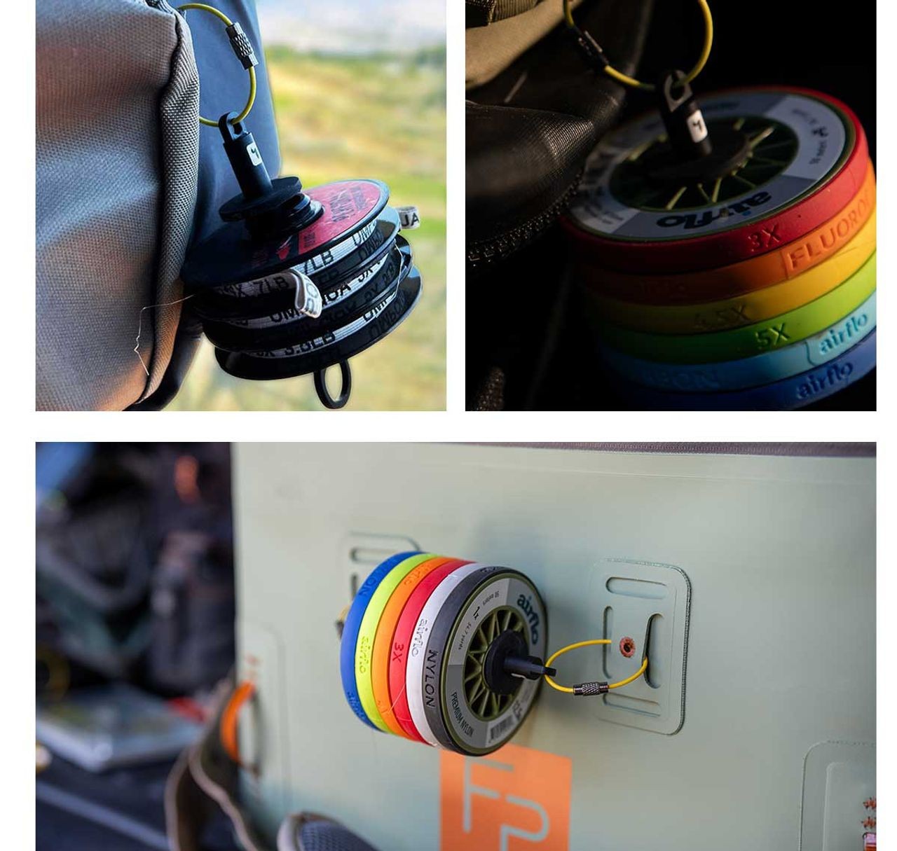 Deux options pour utiliser le support bobine : attaches en acier inoxydable pour fixer les deux extrémités au gilet de pêche de manière à ce que les bobines se placent horizontalement, ou fixer une seule extrémité pour utiliser l'autre extrémité pour des autres accessoires.