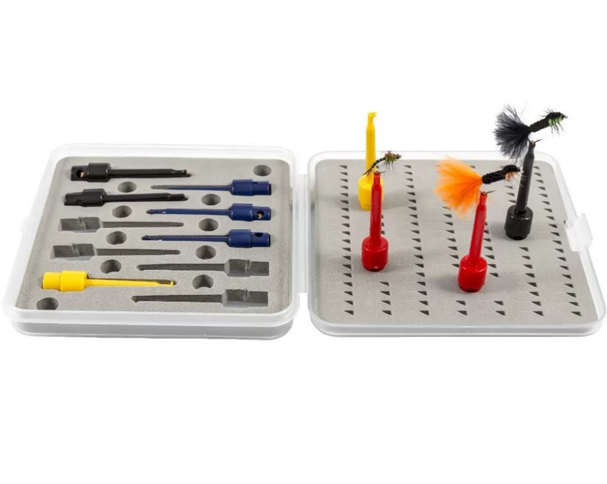 Un côté est doté d'une mousse avec des encoches pour jusqu'à 115 mouches, et les deux côtés contiennent des trous ronds dans lesquels s'insèrent les pinces, ce qui fait l'ensemble idéal de séchage et de présentation des mouches.